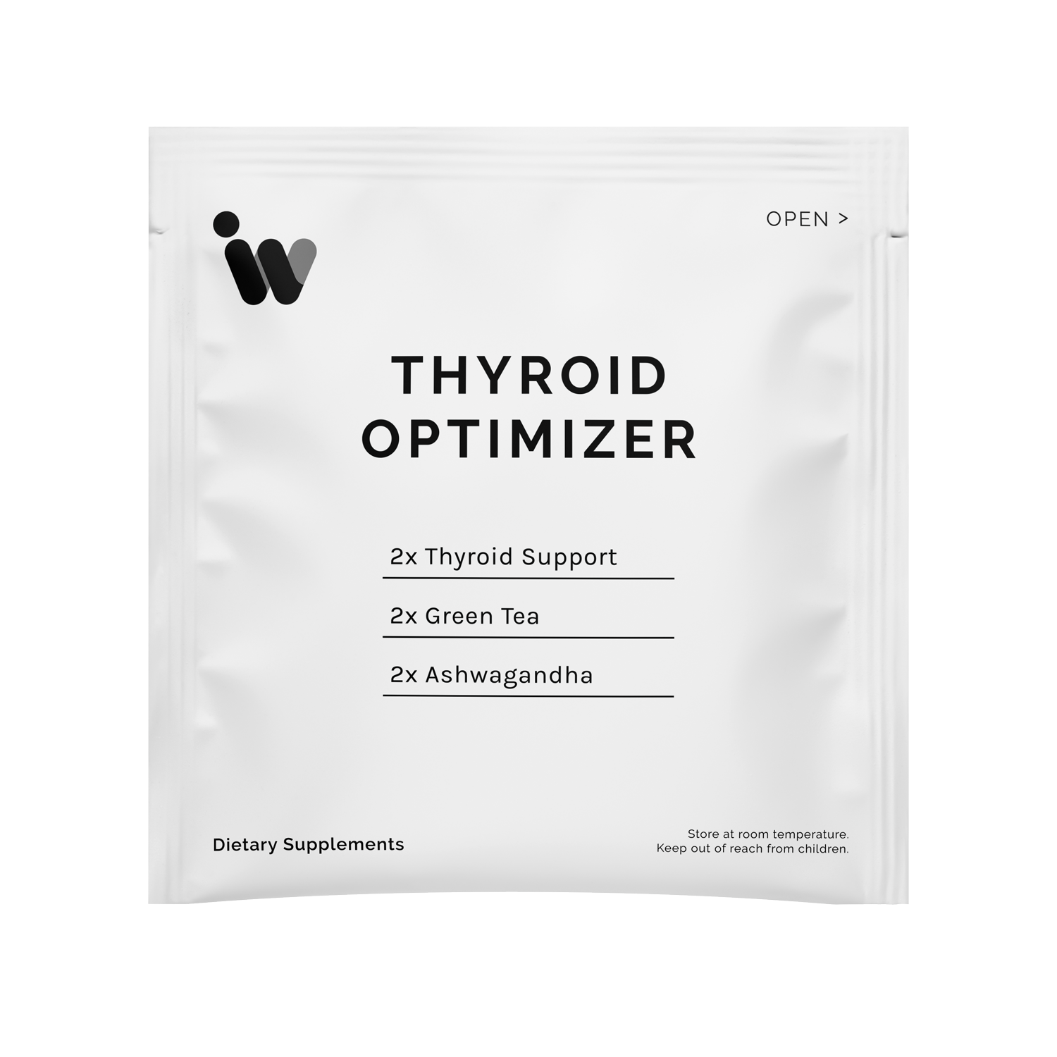 White dietary supplement packet detailing thyroid support blend with green tea and ashwagandha.